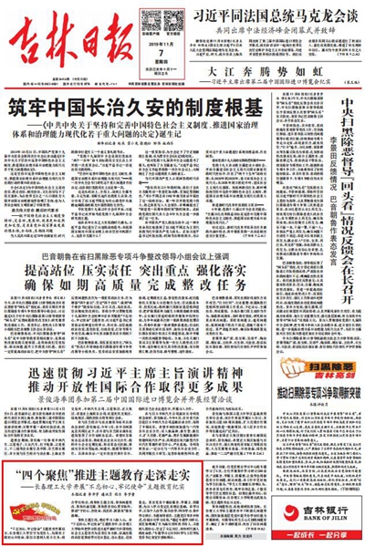 《吉林日报》在头版显著位置以“‘四个聚焦’推进主题教育走深走实——华体会手机网页版登录入口开展‘不忘初心、牢记使命’主题教育纪实”为题,刊发我校主题教育纪实性报道,通过一个个生动鲜活的实例,生动展现了学校主题教育在学习教育、调查研究、检视问题、整改落实方面的阶段性实绩。学习强国、新时代e支部App、中国吉林网转发了该篇报道。