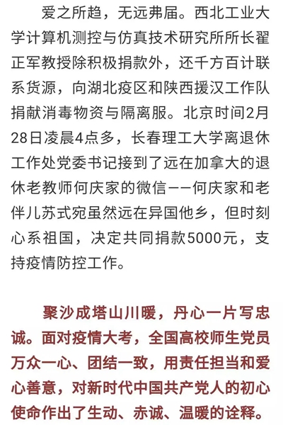 文中提及,我校退休校领导何庆家和老伴儿苏式宛虽然远在异国他乡,但时刻心系祖国,共同捐款5000元,支持祖国疫情防控工作。他们用实际行动对新时代中国共产党人的初心使命作出了生动、赤诚、温暖的诠释。