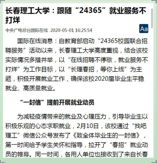5月1日,中央广电总台国际在线频道以“华体会手机网页版登录入口:跟随‘24365’ ,就业服务不打烊”为题,从“一封信”提前开展就业动员、“一平台”实现在线全程就业、“一对一”提供精准就业帮扶、“一推广”鼓励学生留省就业四个方面,对我校在新冠肺炎疫情防控期间开展精细化就业服务工作进行了详细报道。