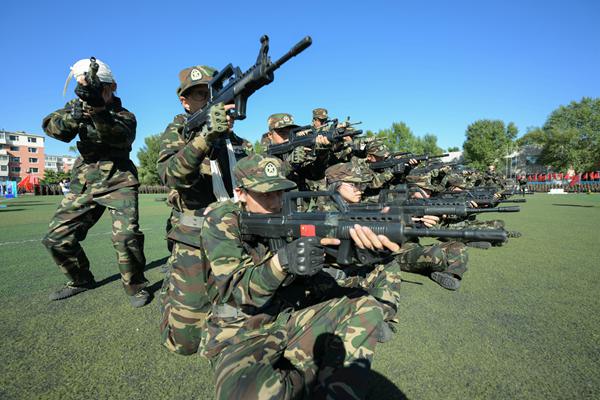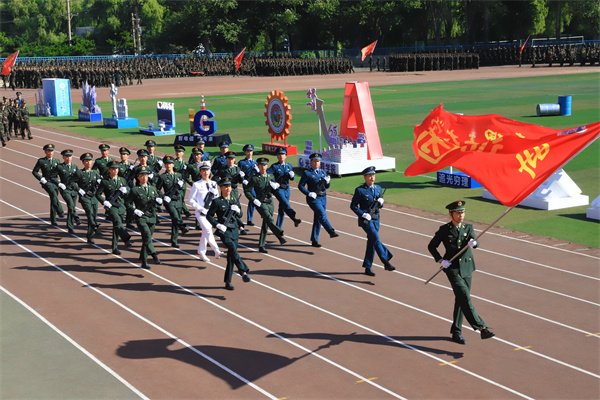 在《中国人民解放军分列式进行曲》雄壮激昂的音乐声中,全体受阅方阵,精神抖擞,迈着整齐划一的步伐依次通过主席台。分列式后是军训科目汇报展示,常规作战小队招式干脆,行云流水;精英作战小队身姿矫健,眼神坚毅;擒敌拳表演,拳拳生风,步步有力;匕首操展示,利刃出鞘,“杀”声震天。