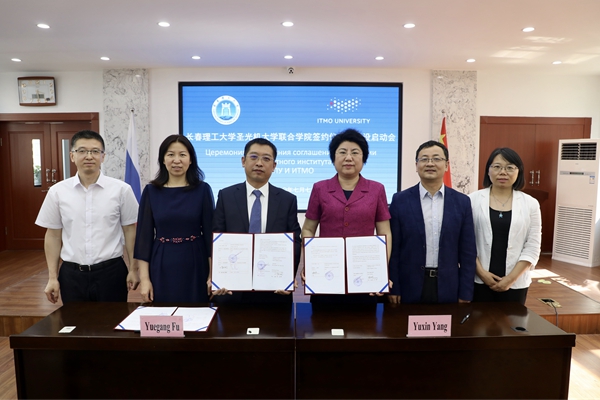 俄罗斯圣光机大学校长瓦西里耶夫,光子学学院院长布格罗夫、副院长沃兹涅新斯卡娅,国际合作处处长伊莉娜·金、主任分析师苗达娃;吉林省教育厅国际合作与交流处处长陈梅;校党委书记杨玉新、副校长付跃刚,相关职能部门和承办学院负责人出席签字仪式暨建设启动会。