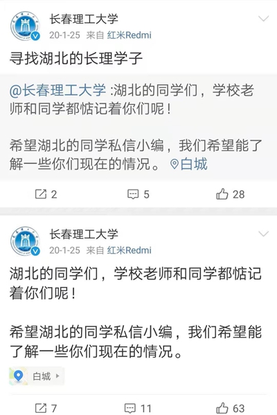 农历大年初一,学校官方微博发出“寻找湖北长理人”活动,当天点击量过万。武汉的长理校友留言说“大年初一刷到了学校的微博,隔着屏幕都能感受到母校的温暖。”