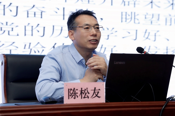陈松友以《中国共产党百年的奋斗历程及主要经验》为题,从中国共产党的诞生、中国共产党百年的光辉历程、中国共产党取得辉煌成就的主要经验三个方面,以中国共产党的创立、发展、壮大为主线,全面回顾了党的光辉历程,深刻阐述了中国共产党“为人民谋幸福、为民族谋复兴”的初心与使命。