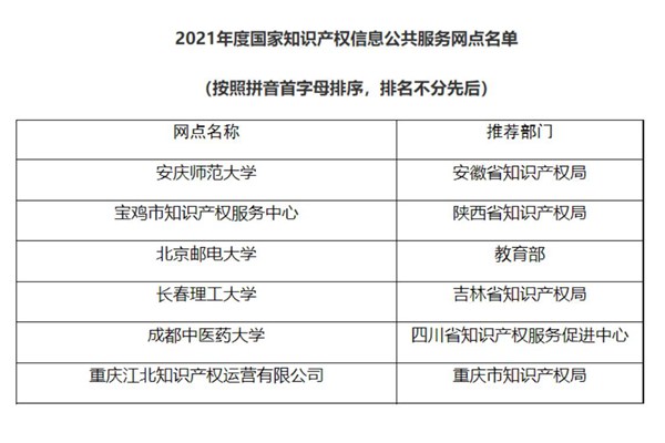 日前,国家知识产权局公布了2021年度国家知识产权信息公共服务网点名单,我校成为首批备案的88家国家知识产权信息公共服务网点之一。