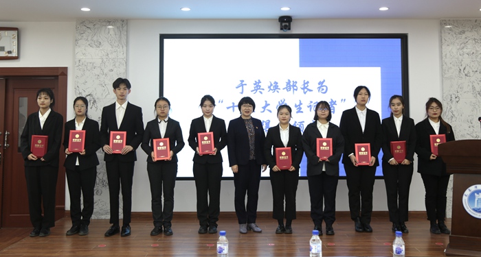 于英焕在讲话中首先对获奖学生记者表示祝贺,对同学们一年来的辛勤工作表示感谢。随后,她向学生记者讲述了中国记者节的来历,表达了对新中国杰出的新闻工作者范长江的崇高敬意。她说,举办校媒联盟“十佳大学生记者”评选活动,是学校对学生记者的高度重视以及对其一年来工作的充分肯定,希望大学生记者们坚持梦想、保持热爱并为之不断奋斗,不负时代,不负韶华。“热爱可抵岁月长,努力去发光发热,让青春昂扬无悔”,真挚的话语鼓舞了在场所有奋斗在校园新闻第一线的学生记者。