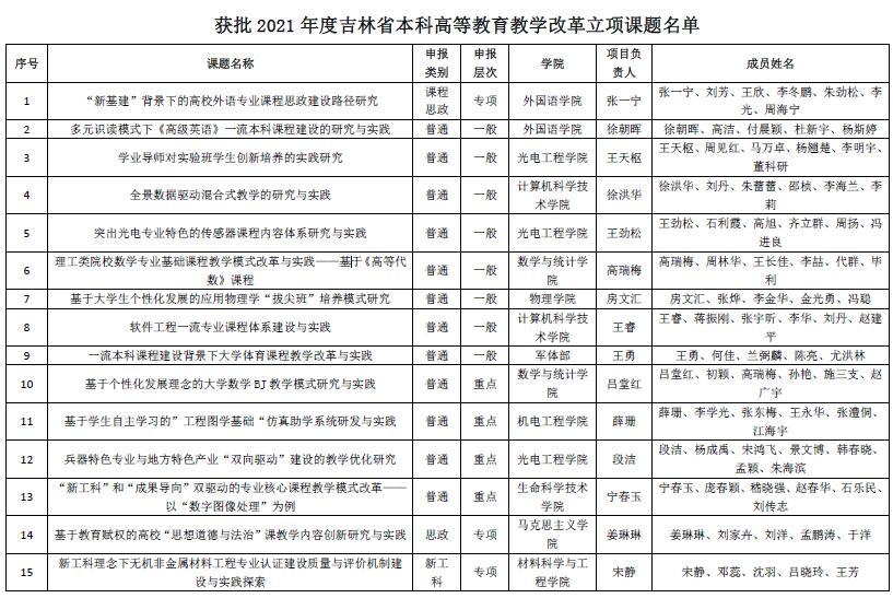 近日,吉林省教育厅发布了《关于公布2021年度吉林省本科高等教育教学改革立项课题和协同育人项目名单的通知》(吉教高〔2021〕25号),我校共有17个项目获批立项。