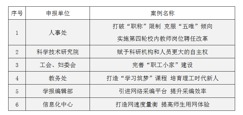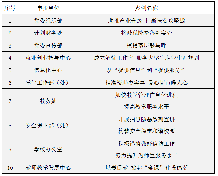 为进一步提升机关各部门服务基层、服务师生、服务发展的能力,发现、总结、推广机关服务型党组织建设的优秀案例成果,机关党委开展了第二届“最佳实事”评选活动。经部门申报、评委会评审、机关党委委员会审议,现将获得机关党委第二届“最佳实事”奖和“最佳实事”入围奖的单位及案例予以公示,听取全校师生意见。