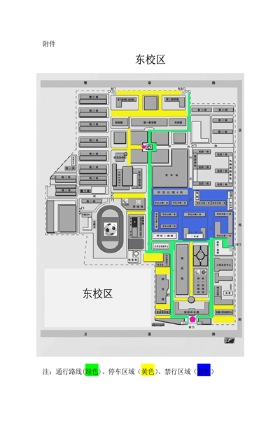 3.东校区学生宿舍区域实行交通管制。正门至一食堂后侧东门可通行,社会车辆沿图书馆前—体育馆前—北门通行并有序停放于沿途各停车场。东门车辆通道作为出口单向通行。