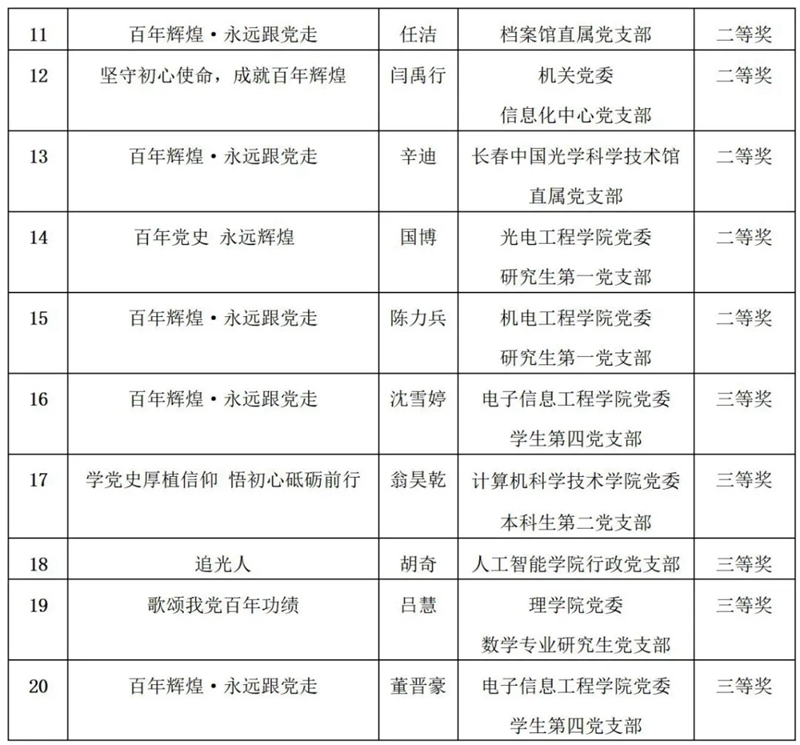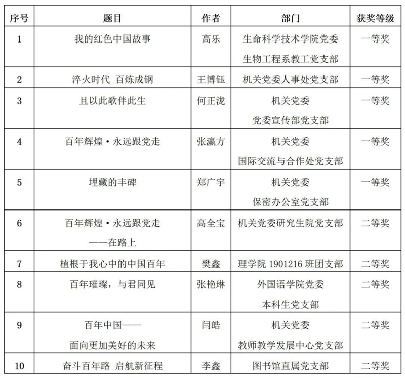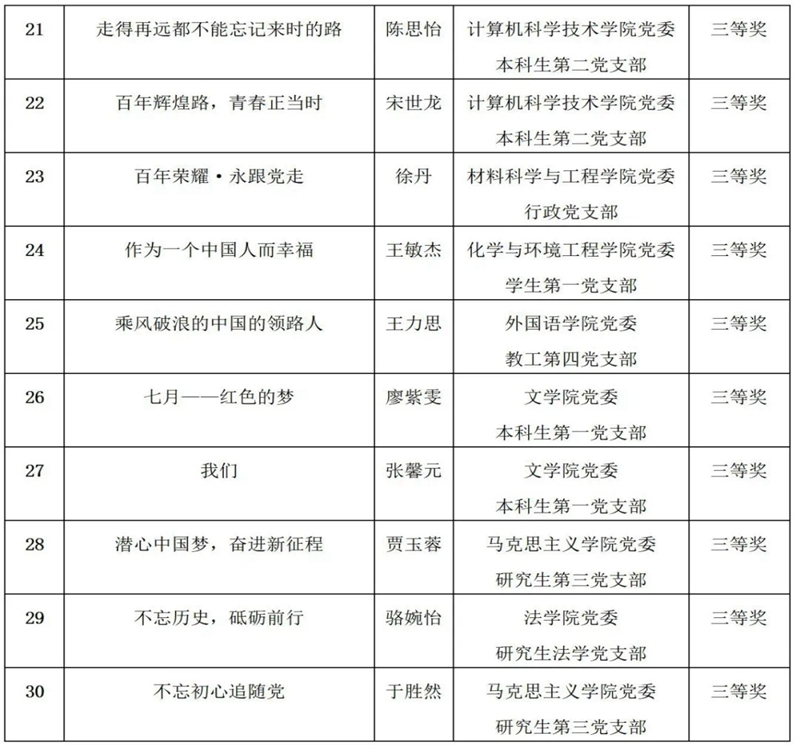 为从党的百年伟大奋斗历程中汲取继续前进的智慧和力量,充分展现党的十八大以来党和国家事业取得的辉煌成就,抒发对党的忠诚和热爱,凝聚建设特色高水平大学的强大动力,校党委于2021年3月至5月间开展了“百年辉煌·永远跟党走”主题征文比赛。全校各基层党委积极动员,师生踊跃参加,共提交征文365篇。经专家评委评选,党委宣传部审定,最终评选出一等奖5篇、二等奖10篇、三等奖15篇。具体获奖名单和优秀组织单位见附件。校党委将为优秀组织单位颁发奖牌,为获奖个人颁发证书。