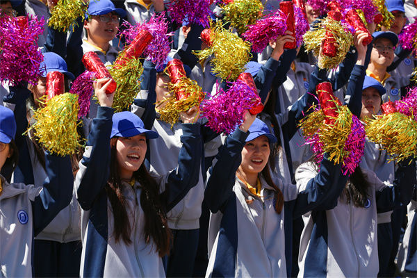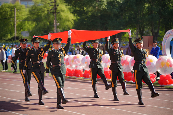升旗仪式上,国旗护卫队迈着整齐划一的步伐护送鲜艳的五星红旗进入运动场,国旗在雄壮的《义勇军进行曲》中冉冉升起,全场师生齐声高唱国歌,面向国旗行注目礼。